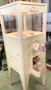 社有林のトドマツ材と木質由来の透明板をご支給いただき、因伯雅茶をベースに同社オリジナルカプセルトイ装置「王子の森のカプセルトイ」を製作しました。平屋根です。